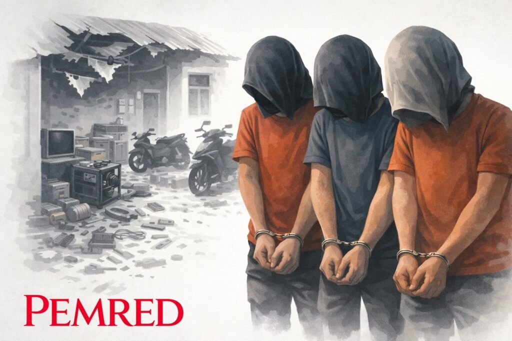 Tiga pemuda yang ditangkap masing-masing berinisial YU (19), RE (22), dan AB (26). Polisi menyebut ketiganya berperan langsung dalam aksi pencurian tersebut. Dalam pengungkapan kasus ini, polisi mengamankan puluhan barang bukti. Di antaranya dua unit sepeda motor, satu bilah senjata tajam, televisi, ban motor, berbagai spare part kendaraan, peralatan bengkel, serta perlengkapan rumah tangga.